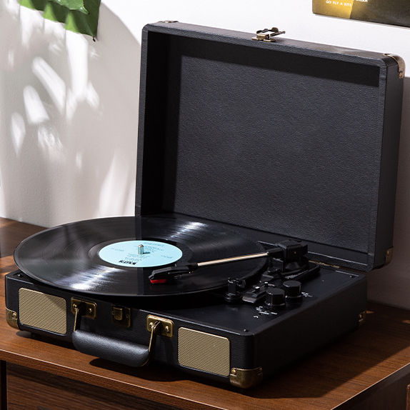 All-in-One tragbares Design mit echtem Lederkoffer, automatischer Stoppfunktion und einfacher Bedienung für authentischen Klang.